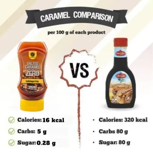 Zutaten: Wasser, Süßungsmittel: Maltitol*, modifizierte Maisstärke, natürliches Aroma, Aroma, Salz, Säureregulatoren: Milchsäure und Zitronensäure, Farbstoff: Karamell, Konservierungsmittel: Kaliumsorbat.